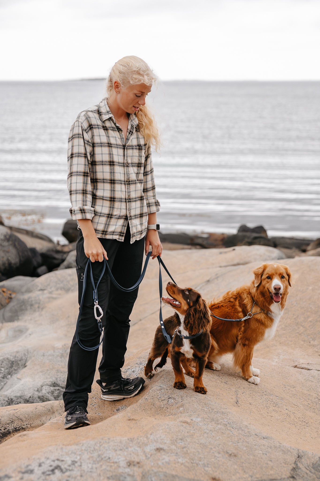 Dubbelkopplet är designat av Malin på @hoglandshunden och bygger på en enkel idé: två hundar, ett handtag, noll trassel. Tack vare länkar som rör sig oberoende av varandra får hundarna rörelsefrihet utan att snurra ihop sig. Handtaget är smidigt att hålla i och gör det möjligt att addera hur många hundar du vill - eller bara haka av och gå med en hund.