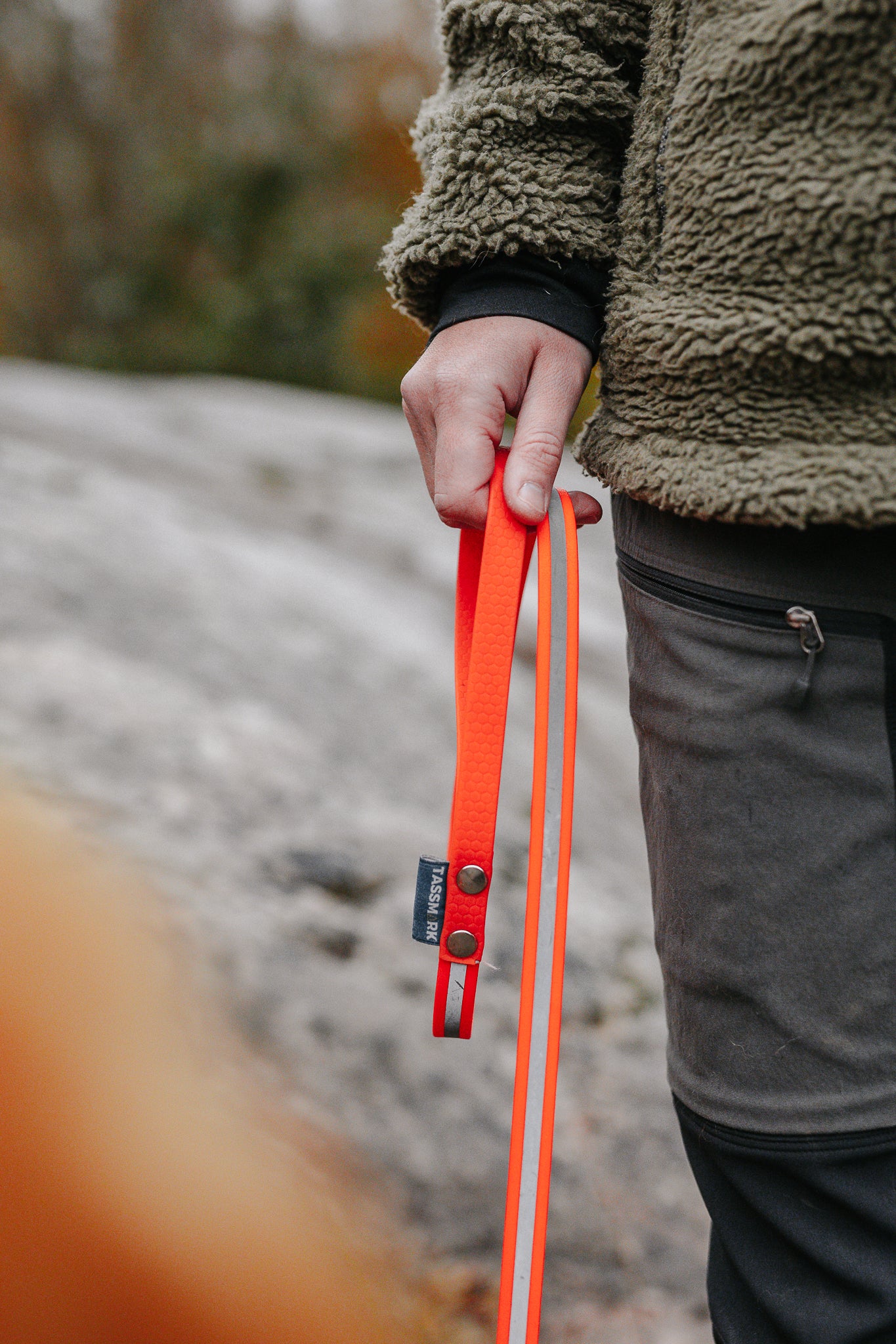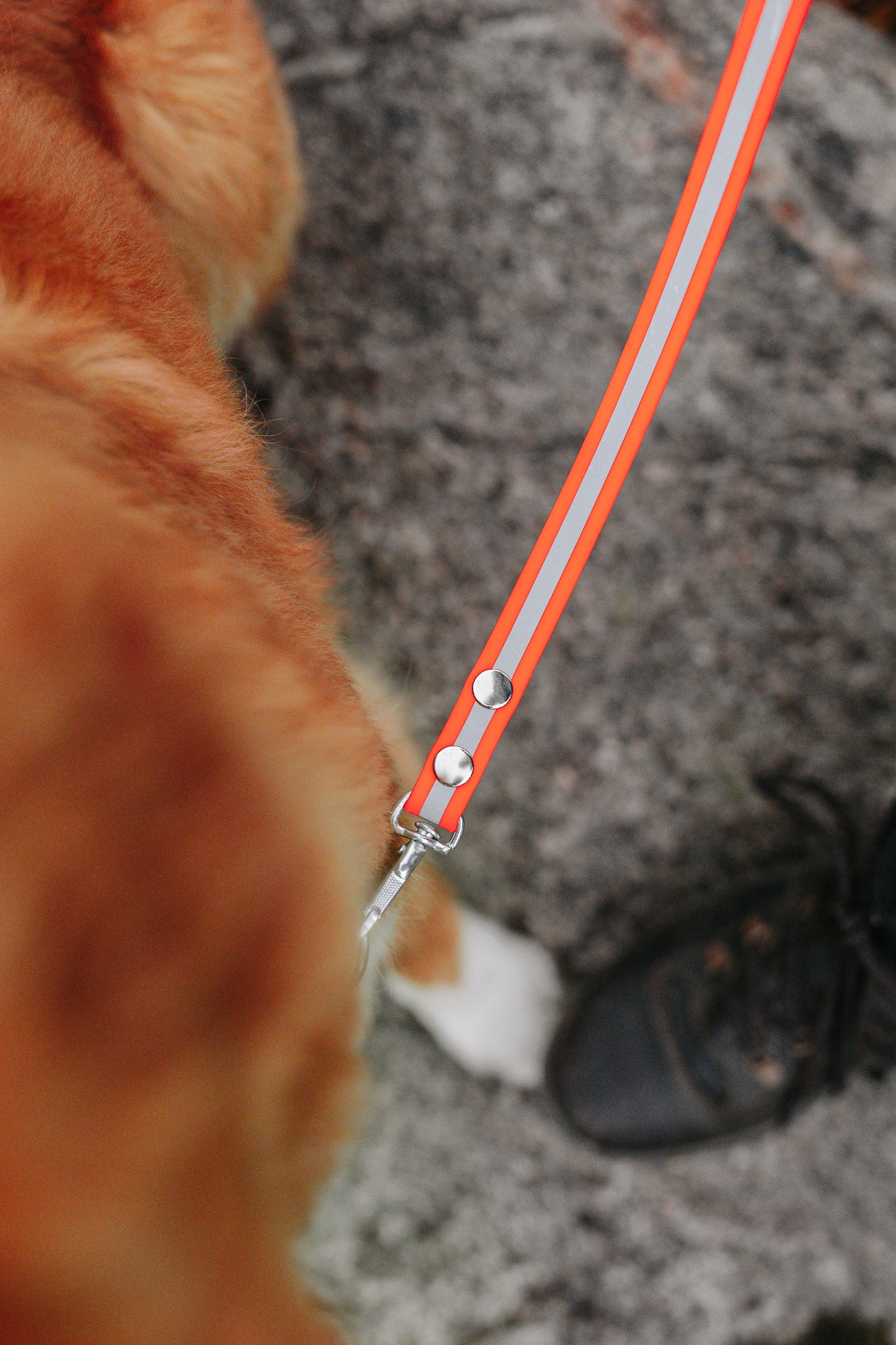 jättebra koppel som verkligen syns! Både med reflexen och att det är orange. Det är lite stelare än de vanliga kopplen men hjälper så mkt på kvällen nu när det är mörkt mellan lyktstolparna på landet!